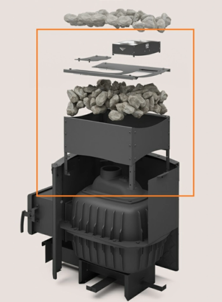 Большое количество качественно нагретых камней, обеспечивает стабильность температуры в парилке. Печь снабжена удобным ящиком зольника, который также является регулятором интенсивности горения. Колосник из литейного чугуна, являющийся элементом конструкции, обеспечивает равномерное устойчивое горение по всей длине топки.