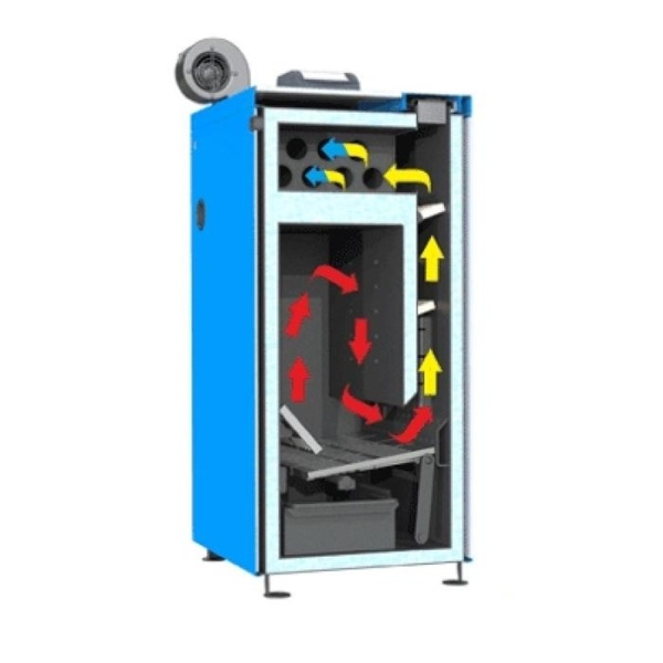 Основная особенность котла – высокая степень теплоизоляции и газоплотности, теплообменник комбинированного типа. Корпус котла под декоративной обшивкой изолирован базальтовым картоном. На обшивке дверок располагаются вентиляционные отверстия для охлаждения наружной поверхности котла. Дверца зольника оборудована воздушной заслонкой, снабжённой винтом с ручкой, которым можно регулировать приток первичного воздуха в камеру сгорания.