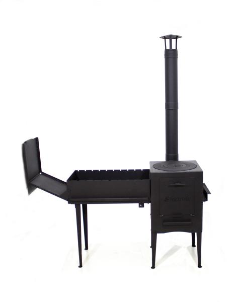 Конструкция позволяет одновременное или независимое приготовление и горячего блюда, и шашлыка, гриля. Мангал-казан оснащен дымоходом. Печь под казан можно использовать отдельно, мангал крепится с любой стороны от печи.