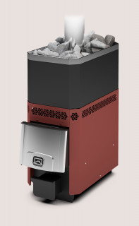 • Выход дымовой трубы смещен от края к центру каменки, что значительно упрощает монтаж дымохода.