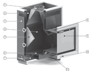 Эффективность работы теплообменника значительно увеличена за счет того, что он размещен в топке печи и нагревается непосредственно излучением от пламени