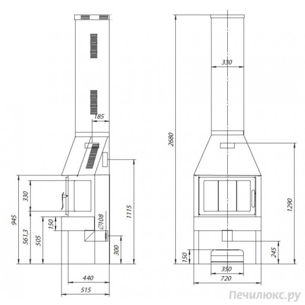 Топка печи камина изготовлена из стали толщиной 6 мм, оборудована чугунным колосником и футерована литьевым шамотом. Толщина стали контура печи — 3 мм. Грамотно спроектированный конвективный контур производит хороший съем тепла печи.