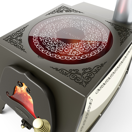 Чугунная дверца топки с окошком из жаропрочного стекла и самоохлаждаемой ручкой дают возможность удобно управлять процессом горения