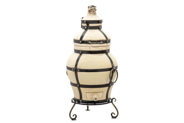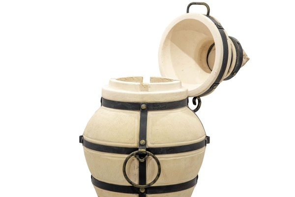 "Ахмат" выполнен в виде округлого бочонка небольшого объёма. Имея небольшой вес, его очень удобно брать с собой на природу, на дачу. Тандыр имеет крышки двух уровней (колпачок и крышку). Правильно выполненный колпачок, позволяет не терять тепло при открывании тандыра. А крышка с удобными ручками позволяет легко открывать тандыр и закладывать в него продукты для приготовления. Кованная подставка - ножки обеспечивает удобное использование тандыра. Керамический тандыр выполнен в спокойном бежевом цвете, поверхность его имеет рельеф в виде мелких точек. Изготовленный из шамотной глины высокотемпературного обжига он обладает высокой теплопроводностью, экологичностью, прочность и долговечностью более 10 лет.