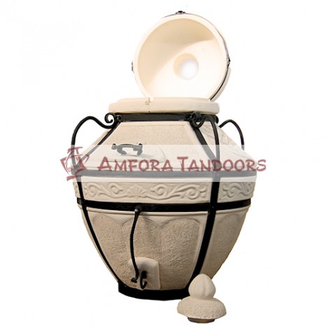 Форма напоминает амфору. Заключено изделие в кованый ажурный каркас. К печи прилагается подставка под стать изделию, и стойка для шампуров также выкованная вручную. Стоит отметить, что не ко всем моделям такой печи в комплектацию входит подобный функционал.