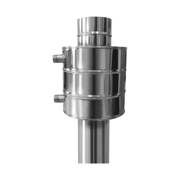 Для этой цели на дымоход печи устанавливается универсальный регистр (теплообменник), из нержавеющей стали с двумя штуцерами ¾ дюйма, который с помощью соединительных труб и дренажного крана соединяется с выносным баком.